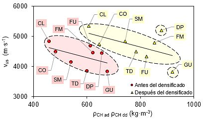 Para explicar estos resultados, la figura 2 presenta las dispersiones de las velocidades de onda antes y después del densificado en función de las densidades correspondientes. Si bien la tendencia general es la disminución de las velocidades de onda en función de las densidades, sus regresiones lineales resultan en coeficientes de determinación bajos (vus ad = -2,33 ρCH ad + 5698 con R² = 0,25 y vus dd = -2,39 ρCH dd + 6563 con R² = 0,29).