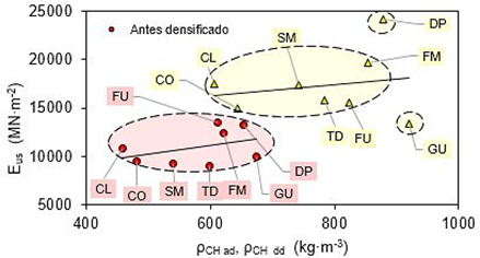 De acuerdo con la figura 3, los valores de los módulos dinámicos se agrupan en dos nubes bien diferenciadas en función de la densidad antes y después del tratamiento. Si bien se observa que los módulos dinámicos aumentan en función de la densidad, se perciben correlaciones bajas (Eus ad = 8,933 ρCH ad + 5813 con R² = 0,15 y Eus dd = 5,73 ρCH dd + 12822 con R² = 0,04).