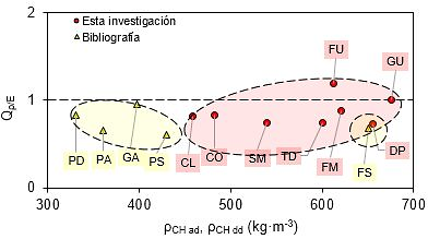 Con excepción de F. uhdei (FU: Qρ/E = 1,19) y el caso especial de G. ulmifolia (GU: Qρ/E = 1,01), las otras seis maderas estudiadas en esta investigación muestran un índice de calidad inferior a la unidad, al igual que los mismos índices de las maderas revisadas en la bibliografía. Asimismo, se observa que su magnitud es independiente de la densidad aparente antes del densificado, figura 5. Respecto a los coeficientes de variación de los índices de calidad, varían entre 7,1 % (F. uhdei) y 16 % (F. mexicana). El promedio de los índices de calidad de esta investigación son 17,6 % mayores comparativamente al promedio de los índices reportados en la bibliografía. Un valor menor a la unidad del índice de calidad significa una ganancia en el módulo de elasticidad con relación a la de la densidad. De tal forma, una madera con un índice de calidad comparativamente menor sugiere un mayor potencial para densificado.
