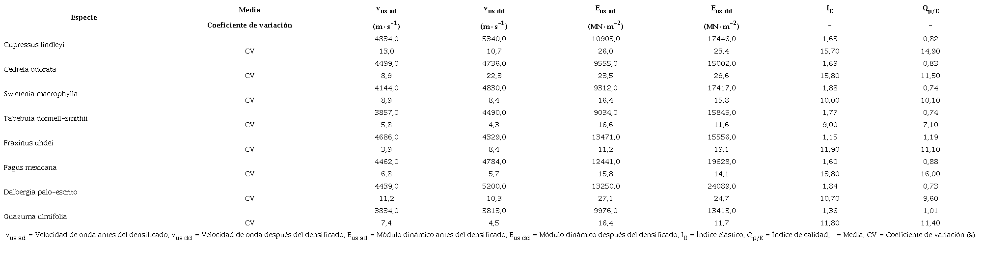 Las magnitudes de las velocidades de onda antes del densificado, tabla 3, son similares a las reportadas en la bibliografía [23]. El promedio de la velocidad de onda antes del densificado fue de 4334 m s-1, después del tratamiento fue de 4690 m s-1. El resultado es un incremento de 8 %, con excepción de F. uhdei con una disminución del 7,6 % y G. ulmifolia con 0,54 %. Después del densificado, los coeficientes de variación de la velocidad de onda disminuyen, con excepción de C. odorata y F. uhdei, cuyos coeficientes de variabilidad aumentan.