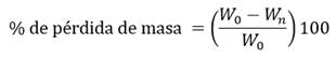 (2)La biodegradabilidad se realiza cortando una muestra del andamio e introduciéndola en PBS por espacio de 72 horas en incubación, a temperatura de 37 ºC. Se saca luego de este tiempo y se pesa. Luego se coloca por x de tiempo en una desecadora, pesando la muestra en estado seco. Se calcula la pérdida de masa a través de la ecuación (3):