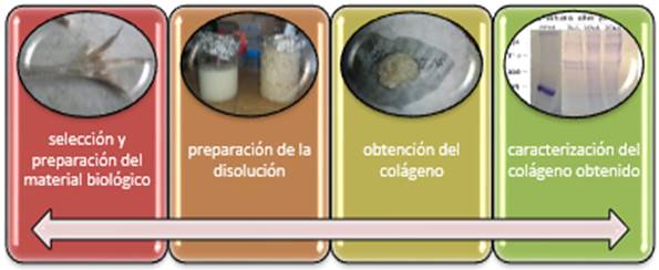 En esta etapa se utilizaron 460 g de patas de pollo y 460 g de piel de cerdo como material biológico para la extracción del colágeno. En su preparación una trituradora, ácido acético al 30 %, agua destilada, cloruro de sodio 100 % (NaCl), papel de filtro o filtro para dializado, tubos de ensayo desechables, cristalería de laboratorio, centrifuga y una balanza. Los pasos seguidos para la obtención del colágeno y su caracterización se muestran en la figura 1 y se describen seguidamente.