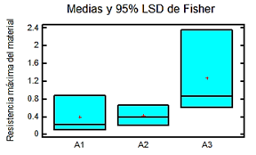 Aplicando un análisis estadístico con el programa ANOVA se obtuvieron los datos mostrados en la tabla 1 y la figura 10. Donde A1 es el andamio de patas de 1mm de espesor, A2 es el andamio de patas de 0,5 mm y A3 es el andamio de cerdo.