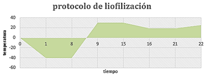 El liofilizado se realizó durante 22 horas, el cual consta de tres etapas. La congelación a una temperatura de -40 oC y un tiempo de 7 horas. El secado primario a una temperatura de 19 oC durante 5 horas y el enfriamiento final hasta la temperatura ambiente. El proceso en su totalidad se observa en la gráfica de la figura 3.