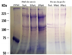 En la figura 5 se muestran las electroforesis realizadas a los colágenos de patas y cerdo obtenidos mediante el proceso de extracción ácida, en ella se observan 2 bandas cercanas entre los 100 y 130 KDa que corresponden a cadenas α y una banda cercana a los 225 KDa que representan cadenas β. Las bandas que se observan por sobre los 225 KDa pertenecen a los trímeros ϒ.
