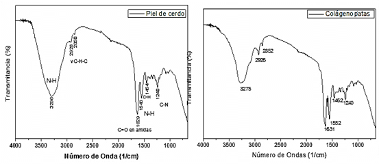 Las pruebas de FTIR realizadas se presentan en la figura 6, en ella se destacan para patas de pollo, como amida A (32751/cm), B (2926 1/cm), I (1631 1/cm), II (1552 1/cm), III (1240 1/cm) y para piel de cerdo como la amida A (3296 1/cm), B (2926 1/cm), I (1629 1/cm), II (1548 1/cm), III (1240 1/cm).