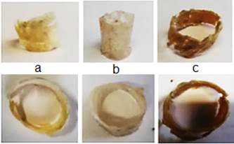 Los andamios obtenidos se observan en la imagen de la figura 7. Se puede presenciar que los andamios a y b, poseen una coloración más clara que el que se exhibe en la figura 7c. Esto pudiera deberse a un parámetro denominado luminosidad (L) que se incrementa cuando se liofiliza una muestra de origen natural [25]. Este parámetro, que se define como el flujo de luz en una dirección dada y depende del número y la orientación de las superficies reflectantes de esta, aunque incentiva la diferencia de color, depende de factores como la velocidad de congelación. Según [25] como la congelación rápida genera cristales pequeños y orientados al azar, la luminosidad de los productos que se congelan con mayor rapidez, es mayor que la de productos con congelación más lenta. En el caso que nos ocupa se utilizó la misma temperatura de congelación (-40 ºC) y el mismo material para la confección del molde, pero el espesor de la pared de los andamios fue diferente, por lo que existe la posibilidad que el andamio de espesor 1 mm, figura 7c, se congelará a menor velocidad que los demás, obteniendo una coloración menos luminosa.
