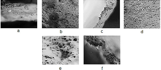 Lo que se demuestra a través de la microscopía superficial donde existen diferencias en la disposición de los poros, observándose una mayor cantidad de estos y de menor tamaño, en el andamio de cerdo (0,1mm) figura 8c y 8d, sobre la superficie. De igual manera pasa con el andamio de patas de pollo de pared 0,5 mm de espesor figura 8e y 8f, donde se observa una mayor cantidad de poros que en el de 1mm de espesor figura 8a y 8b.