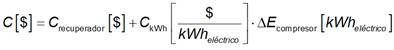 (6)El costo incurrido para recuperar la energía viene dado por el costo del intercambiador recuperador y el costo de la energía eléctrica extra consumida por el compresor para vencer las pérdidas adicionales que introduce el recuperador, o sea, ecuación (7). El costo de instalación del recuperador se consideró un 2 % del costo del equipo y se adicionó al costo del equipo.