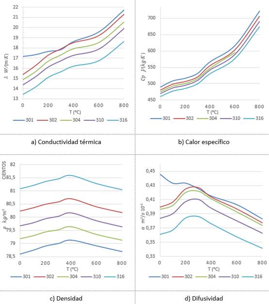 En la actualidad no se dispone de un método de análisis para la predicción de propiedades termofísicas en los aceros inoxidables austeníticos. Por tal motivo en la presente investigación es analizada la influencia de la composición química (C, Mn, P, S, Si, Ni, Cr, Mo) y la temperatura de operación de 0 a 800 ºC sobre cuatro propiedades termofísicas (conductividad térmica, calor específico, densidad y difusividad) en cinco aceros inoxidables austeníticos de marcación AISI 301, 302, 304, 310, 316, obtenidos por laminado y recocidos.
