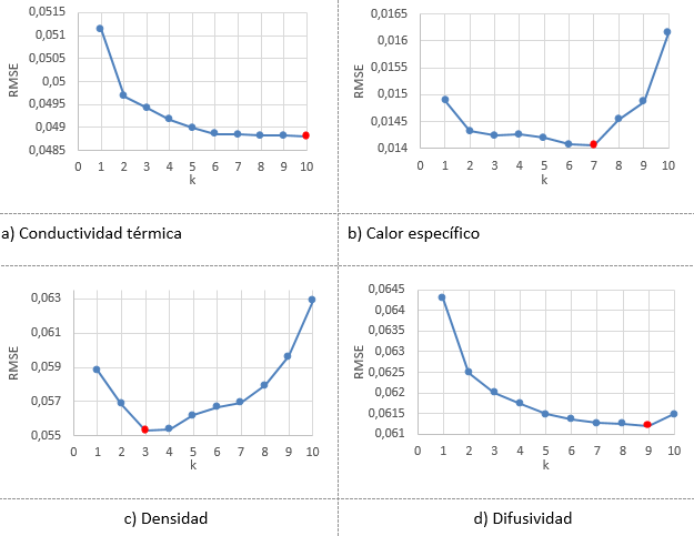 Para cada una de las propiedades se optimiza k mediante una búsqueda de malla, entrenando el modelo para valores de 1 a 10. Es implementada una validación cruzada en la que se toma un 10 % del subconjunto de entrenamiento como subconjunto de validación y esto a su vez es repetido en cinco ocasiones, garantizando la convergencia de los modelos. La figura 2 muestra el desarrollo de las optimizaciones, con los datos previamente centrados y normalizados, en función del aumento de k.