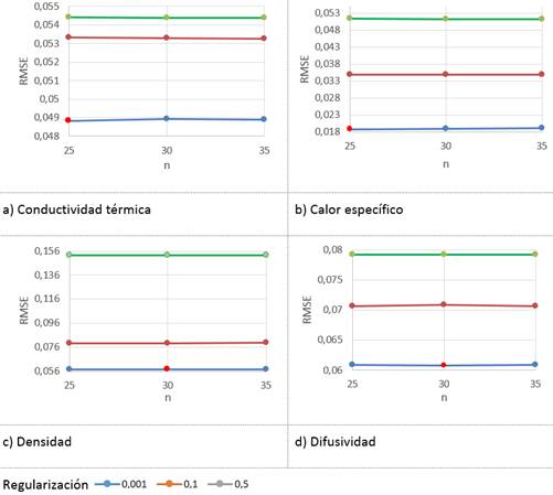 En esta investigación es usado el subconjunto 80 % para entrenar una RNA de una capa oculta para la cual se optimizan,empleando una búsqueda de malla, los hiperparámetros correspondientes al número de neuronas en la capa oculta (n) y a la regularización. Son usadas las métricas RMSE, MAE y R2, la validación cruzada con subconjuntos de validación de 10 % y cinco repeticiones para garantizar tanto la convergencia del modelo como la optimización de hiperparámetros. En la figura 4 es mostrado el desarrollo de las optimizaciones para cada propiedad. En la tabla 3 son resumidas las métricas obtenidas para los modelos preferidos.