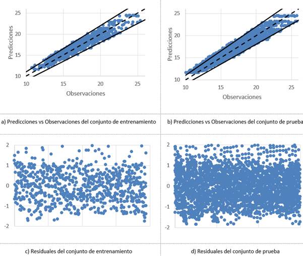 Para la validación de los modelos han sido empleados los datos del subconjunto de prueba reservado previamente para construir los gráficos de predicciones contra observaciones, mostrados en la figura 5 donde además son dados los gráficos de residuales [18], apreciándose que no existe autocorrelación entre los residuos y que la varianza de los errores es constante, además, como los residuales se pueden encerrar entre bandas horizontales se establece que no se existen defectos obvios en el modelo [19]. Las rectas continuas indican las desviaciones ± 10 % y en la mayoría de los casos los valores se encuentran entre estas. Los detalles de porcentaje de error son dados en la tabla 5.