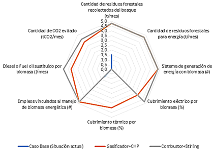 Para hacer el análisis, se valoraron 3 escenarios; en primer lugar la situación actual que tiene el asentamiento con relación al uso de los recursos biomásicos forestales residuales en tareas asociadas a la energía; en segundo lugar, el impacto de la posible instalación de un sistema para la generación de energía basado en la gasificación del recurso acoplado a un grupo de generación de energía térmica y eléctrica de forma combinada, CHP, Combined Heat and Power; y en último lugar, el impacto del montaje y puesta en marcha de un sistema de generación energética constituido por un combustor de residuos forestales acoplado a un motor de combustión externa Stirling para brindar energía mecánica o eléctrica.(tabla 8)