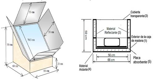 La cocina solar tipo caja construida consta de cinco componentes: Caja de madera (1), como contenedor con espesor de 5 mm. Material Reflectante (2), que cubre completamente todo el interior de la caja, para reflejar la radiación hacia el recipiente de cocción (para este efecto fue empleado la parte interna de latas de cerveza), Cubierta transparente (3), permite la entrada de los rayos solares y evita las pérdidas por convección, Material aislante (4), para el aislamiento térmico del interior de la cocina y placa absorbente (5). Sobre este último elemento se ubica el depósito de agua como se muestra en la figura 1.
