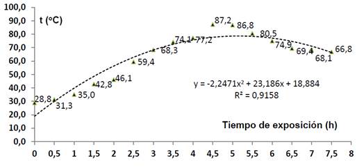 La figura 2 muestra el comportamiento de la temperatura de la masa de agua en el interior de la cocina solar tipo caja construida en este trabajo en un día de experimentos. Se puede observar que a partir de las cuatro horas de exposición se obtienen los valores de temperatura más elevados, con un descenso relativo de pendiente suave a partir de las seis horas y media.