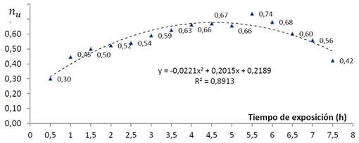 El comportamiento de la eficiencia de la cocina solar tipo caja construida en este trabajo se puede apreciar en la figura 3. Se puede observar que los valores de eficiencia obtenidos superan el 60 % a partir de las 3 horas y media de exposición, llegando a 74 % a las cinco horas y media. Se observa que a medida que aumenta la exposición aumenta la eficiencia, alcanzando los valores más elevados de eficiencia entre las cuatro y las seis horas, con un descenso a partir de las seis horas y media.