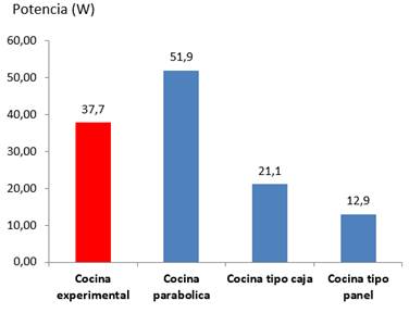 La figura 4 muestra el comportamiento comparativo de la cocina solar tipo caja construida para el estudio. El valor de potencia obtenido (37,78 W), es superior a las cocinas tipo caja (21,1 W) y panel (12,9 W) utilizadas empleadas como comparación [4 ], quedando solo por debajo solo de la cocina parabólica (51,9 W).