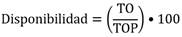 La Disponibilidad, ecuación (2), resulta de dividir el tiempo que la máquina ha estado produciendo, Tiempo de Operación: TO, ecuación (3) por el tiempo que la máquina podría haber estado produciendo, Tiempo Planificado de Producción: TPO. El TOP es el tiempo total de trabajo menos los periodos en los que no estaba planificado producir por razones legales, festivos, almuerzos, mantenimientos programados, etc., se denominan Paradas Planificadas, ecuación (4).