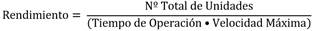 El Rendimiento resulta de dividir la cantidad de piezas realmente producidas por la cantidad de piezas que se podrían haber producido, ecuación (5). La cantidad de piezas que se podrían haber producido se obtiene multiplicando el tiempo en producción por la capacidad de producción nominal de la máquina.