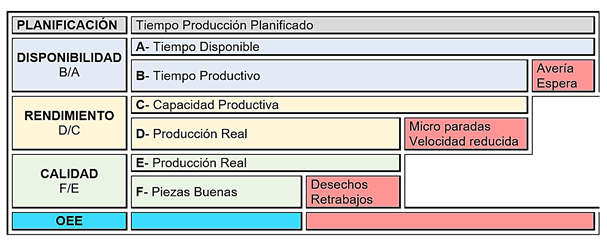 Al mismo tiempo, el OEE analiza y califica los diferentes tipos de pérdidas que pueden producirse en un proceso productivo. Se define en Seis Grandes Pérdidas, que hacen reducir el tiempo efectivo de proceso y la producción óptima a alcanzar [12, 13, 14].