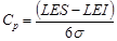 (1)En donde Cp es el índice de capacidad potencial del proceso, LES se refiere al límite de especificación superior, LEI representa el límite de especificación inferior y σ es la desviación estándar del proceso. El índice Cpk se determina mediante las ecuaciones (2), (3) y (4), [18].