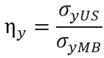 (9)Se calcularon los parámetros de eficiencia. Esta se define como la razón entre la propiedad de la unión soldada y la del material base. De esta manera las eficiencias a fluencia ?#61544;y y y a rotura rotura ?#61544;u se determinaron según la ecuación (10) y la ecuación (11). Los subíndices US y MB se refieren a la unión soldada y al material base respectivamente.