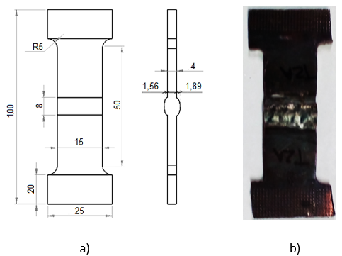 En la figura 2a se encuentran las probetas soldadas rotas después de ser traccionadas. Se ve como la rotura de las tres ocurrió en el material base y no en la zona fundida. Esto muestra que se cumple el objetivo de que la unión soldada no falle en el material de aporte, y sí en el material base.