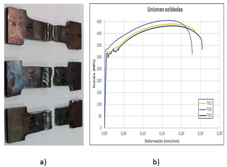 En la figura 2b se muestran los gráficos de tensión-deformación obtenidos de los ensayos a tracción realizados en la máquina MTS810 a las probetas de las uniones soldadas. Se denotan como T01, T02 y T03.