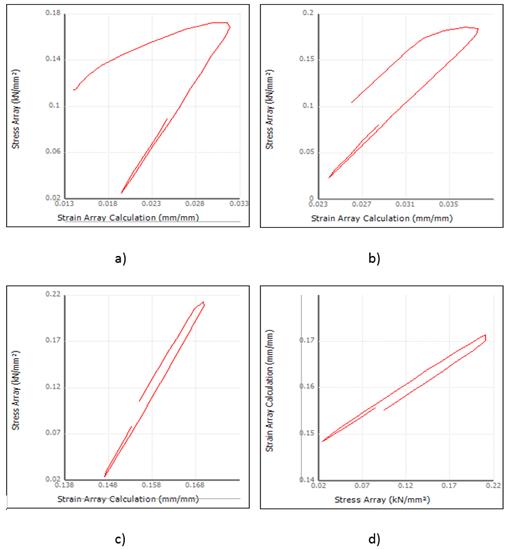 La máquina de ensayos utilizada permite grabar los gráficos de tensión-deformación en determinados ciclos de carga. En este estudio se obtuvieron en los dos primeros y en los dos últimos ciclos. En la figura 3, se exponen, a modo de ejemplo, estos gráficos para la probeta 14. Se observa como en los primeros ciclos de carga hay mayor área debajo de la curva que en los últimos. A juicio de los autores esto se debe a las dimensiones de la grieta. Cuando la grieta es pequeña, la probeta tiene mayor resiliencia, no así cuando se está cerca de la rotura final, donde la grieta ha aumentado su tamaño hasta valores cercanos a la longitud crítica. Este comportamiento se observó en las 17 probetas que fallaron.