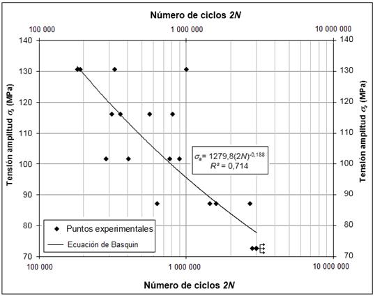 Como se aprecia en la figura 4, el coeficiente de resistencia a la fatiga S´lf y el exponente b de la ecuación de Basquin son iguales a 1 279,8 MPa y -0,188, respectivamente. El ajuste R² es igual a 0,714. Debido a la gran dispersión que se aprecia en los resultados experimentales del ensayo a fatiga es posible considerar este valor como bueno. Las tres probetas a las que se les interrumpió el ensayo sin que ocurriera el fallo están marcadas con flechas.