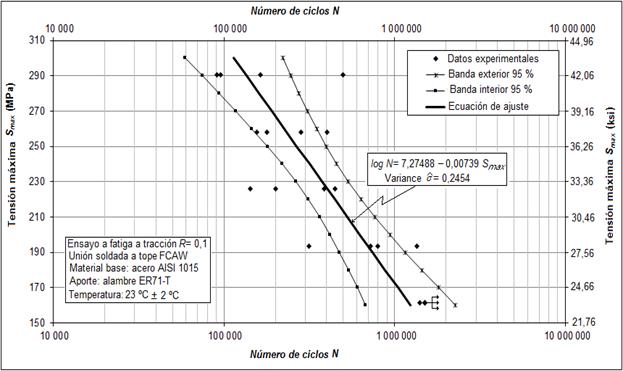 En la Figura 5 está la curva S-N de la unión soldada ensayada en este estudio. Como se observa 15 puntos experimentales se encuentran dentro de las bandas de confianza del 95 %. Este resultado indica el buen ajuste obtenido con el modelo lineal asumido para obtener la curva. El ensayo se interrumpió en el quinto nivel de carga a una tensión máxima igual a 161,4 MPa. En la curva de ajuste, a este valor de tensión se corresponde un número de ciclos igual a 1 091 190.