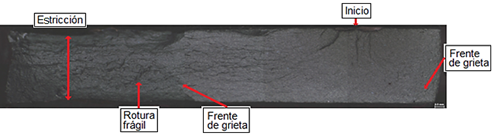 En la figura 6 se muestra, a modo de ejemplo, la observación realizada a la probeta F14. Esta probeta fue ensayada a una tensión máxima de 193,6 MPa y una amplitud de 87,1 MPa. El número de ciclos que soportó fue igual a 725 597 y el fallo se produjo en la ZAT. Se señala el inicio de la grieta de fatiga y la posición del frente de la grieta en el momento en que ocurrió la fractura. Se aprecia la diferencia de textura entre la zona donde creció la grieta y en la que tuvo lugar la rotura frágil debido a la sobrecarga estática. También se observa la estricción característica del fallo por tracción.