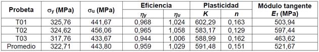 La tabla 3 muestra las diferentes propiedades determinadas con el ensayo a tracción (Límite elástico ?#61555;y y la tensión última ?#61555;u ). La columna Plasticidad se refiere a los parámetros Coeficiente de resistencia K y Exponente de endurecimiento por deformación n para ajustar la relación entre la tensión y la deformación en la zona plástica a través de una ecuación del tipo Hollomon.