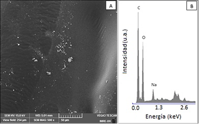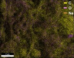 El espectro (EDS) mostró que la superficie activada de los andamios de PLA se encuentra compuesta por C, O y Na, figura 1B. En el caso del carbono, debe proceder del PLA, mientras que el O debe provenir tanto del polímero como de la microestructura resultante del tratamiento alcalino. Por otro lado, el pico correspondiente al Na confirma la efectividad del tratamiento de activación utilizado. En la figura 2 se puede apreciar la distribución que de forma general presentaron estos elementos en las superficies activadas. Es de notar que en todos los casos no se distribuyen de forma homogénea y que por su contenido predomina el carbono, elemento que como anteriormente se expuso, forma parte del material polimérico del sustrato.
