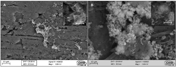 En la figura 3 se muestra la morfología de las superficies de los andamios después de su tratamiento mediante los dos esquemas destinados a la deposición de fosfatos de calcio. Tanto a bajas como a altas magnificaciones se observaron significativos cambios en la morfología generada por ambos esquemas en comparación con la superficie activada. En las imágenes con mayor magnificación, ver recuadros en la figura 3. Se apreció la presencia de aglomerados formados por estructuras que presentan nano-placas en sus superficies, comportamiento observado en recubrimientos de fosfatos de calcio depositados sobre sustratos metálicos en trabajos previos [20, 21]. Además, ese comportamiento ha sido reportado para este tipo de recubrimientos por diferentes autores [22]. Por otro lado, en dichas imágenes se corroboró que los aglomerados cubren parcialmente las superficies tratadas. Los aglomeradas observados deben ser total o parcialmente el resultado de la precipitación de fosfatos de calcio que ocurrió durante el proceso de deposición. Como consecuencia de la precipitación se produjo una disminución del pH desde valores de aproximadamente 6 hasta valores de alrededor de 5,4. No obstante, como se expuso en los materiales y métodos, en la disolución correspondiente al esquema de deposición número 2 se incrementó el pH hasta un valor de 7,3. Es conocido que los fosfatos de calcio son pH dependientes y que en específico las apatitas resultan más estables que el resto de dichos compuestos a valores de pH más elevados [22, 23].