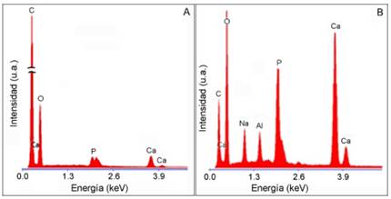 En la figura 4 se muestran espectros (EDS)] puntuales de zonas ocupadas por los agregados observados en la figura 3. Los picos del calcio y del fósforo en las superficies resultantes del esquema de deposición 2 fueron significativamente más intensos que los obtenidos con el esquema de deposición 1, figura 4. Además, el análisis semi-cuantitativo (MEB-EDS) corroboró que el esquema de deposición 2 generó contenidos significativamente superiores de calcio y fósforo en la superficie activada del PLA. Por otro lado, el pico del carbono resultó significativamente menos intenso en el espectro correspondiente al esquema de tratamiento 2. Estos resultados indican que el segundo esquema de tratamiento posibilita obtener un mayor espesor de capa y(o) una mayor homogeneidad del recubrimiento que el primer esquema.