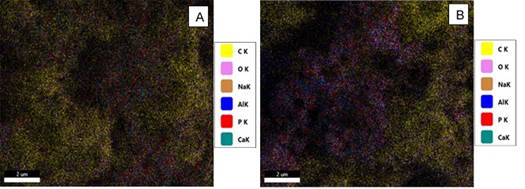 En la figura 5 se muestra la distribución de los elementos que componen la superficie de los andamios de PLA después de ser sometidos a los dos esquemas de deposición de los recubrimientos de fosfatos de calcio. Los componentes principales, en ambas superficies, son el carbono y el oxígeno. No obstante, los contenidos de ambos elementos resultaron significativamente inferiores a los mostrados por la superficie del PLA activada. También el contenido de sodio mostró un comportamiento similar, al disminuir de 8 % a 2-4 %. En general, esto se encuentra relacionado con la incorporación de calcio y fósforo a las superficies tratadas. No obstante, es necesario precisar que el oxígeno es uno de los constituyentes de los fosfatos de calcio y que además, tanto el sodio como el carbono pueden dopar las apatitas [25]. Adicionalmente, se observó una distribución no uniforme de los elementos que forman ambas superficies.