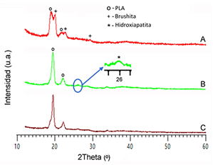 En la figura 6 se muestran los patrones de difracción (DRX) de muestras de PLA antes y después del tratamiento para la deposición de recubrimientos de fosfatos de calcio. El difractograma de rayos X de las superficies activadas mediante el tratamiento alcalino (C en la figura 6)] no mostró el pico a ~16° reportado para le PLA por Mondal y colaboradores, el que se origina predominantemente al encontrarse ordenadas las cadenas poliméricas en la forma intermedia entre las estructuras amorfa y cristalina [26]. Ello pudiera estar relacionado con la presencia de una estructura amorfa en las probetas de PLA. El pico presente en 2Theta = 19° fue asignado a los cristales del PLA, el mismo también fue observado por Deplaine y colaboradores en superficies de PLA con recubrimientos apatíticos [11]. Además, el pico presente en 2Theta = 22° también fue asignado a dicha fase.