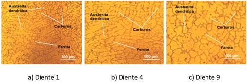 En los dientes analizados las microestructuras obtenidas presentan fases austenita, ferrita y carburos del tipo Cr23C6, pero con variaciones en el tamaño del grano con número de 3,5 y de 5 respectivamente, lo cual está asociado al proceso de solidificación.