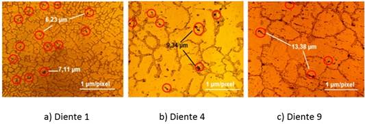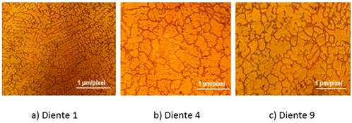 Al analizar el tamaño de los granos de los dientes, según la norma ASTM Standard E112, se determinó que, en un área de 0,842 μm, para los dientes 4 y 9, el tamaño aproximado es No. 5 y para el 1 es No. 3,5; resultados obtenidos para una observación de 1 μm/pixel. Con la determinación de este, se observa en los límites de los mismos un engrosamiento, indicativo de la precipitación de carburos de cromo. La variación del tamaño del grano tiene influencia en las propiedades finales de la aleación.