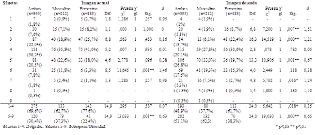 La Tabla 1 refleja que la imagen actual más frecuente aparece en la silueta 4, tanto en hombres (35,8%) como en mujeres (41,0%). Respecto a la imagen deseada, la preferida por las mujeres también es la silueta 4 (30.6%), mientras que los hombres prefieren la silueta 5 (33,0%). En cuanto a la sobrecarga ponderal, se aprecia que el 37,3 % de hombres y el 22,4% de mujeres fueron clasificados en la categoría de sobrepeso/obesidad ( χ 1 2 =13,033; p=,001; d=0,63).