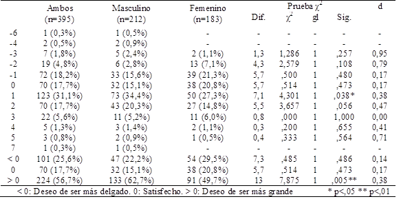 El valor de discrepancia permite clasificar a los sujetos en satisfechos o insatisfechos con su cuerpo (deseo de ser más delgados o más grandes). Solo el 17,7% de los participantes están satisfechos con su imagen corporal, habiendo más mujeres satisfechas (20,8%) que hombres (15,1%). Un porcentaje mayor de hombres (62,7%) que de mujeres (49,7%) desearían ser más grandes ( χ 1 2 =7,875; p=,005; d=0,38).