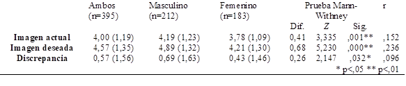 Considerando la muestra total (véase Tabla 3), la imagen deseada media es significativamente superior a la imagen actual media (Z=7,188; p<,001; r=,221). Este resultado indica que la imagen deseada media es más 'grande' que la actual. Al diferenciar por sexos, se aprecia que los chicos desean una imagen más grande que las chicas (Z=5,230; p<,001; d=,236). Otro aspecto importante es que la discrepancia (o insatisfacción con la imagen corporal) es significativamente mayor en el sexo masculino (0,69) que en el femenino (0,43), es decir, que los chicos están ligeramente más insatisfechos con su cuerpo (Z=2,147; p=,032; r=0,96).