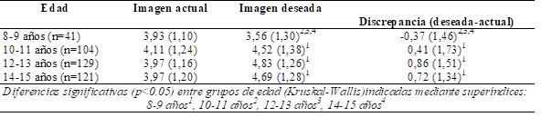 Por último, al analizar los valores medios en función de la edad (Tabla 4), se puede ver que el menor valor de imagen actual se da en los escolares de 8-9 años (3,93), mientras que el mayor valor de imagen actual aparece en los escolares de 10-11 años (4,11). Respecto a la imagen deseada, de nuevo el menor valor se encuentra en los escolares de 8-9 años (3,56) y mientras que el mayor valor se aprecia en los de 12-13 años (4,83). En relación a la discrepancia, cabe destacar que en todos los grupos de edad la discrepancia media es positiva (deseo de ser más grande), excepto en los niños y adolescentes de 8-9 años. El mayor valor de discrepancia (insatisfacción) está presente en los escolares de 12-13 años (0,86) y el menor valor de discrepancia se da en los escolares de 8-9 años (-0,37).