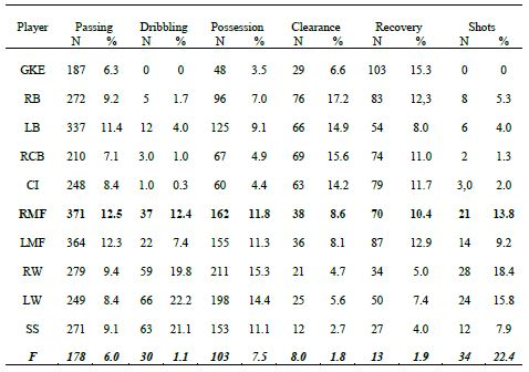Note. N: frequency; %: percentage; GKE: goalkeeper; LB: left-back; RB: right-back; RCB: right centre-back; LCB: left centre-back; RMF: right midfielder; LMF: left midfielder; RW: right winger; LW: left winger; SS: second striker; S: forward