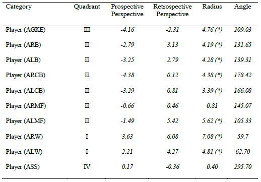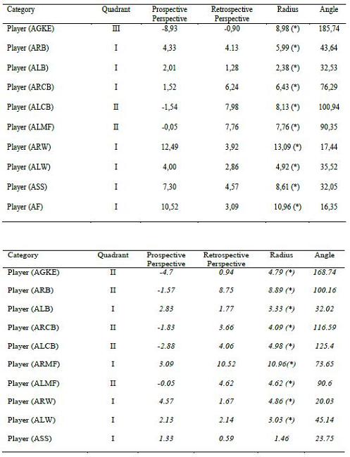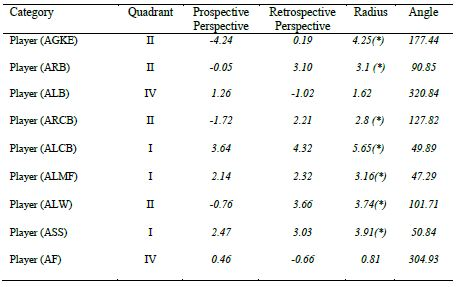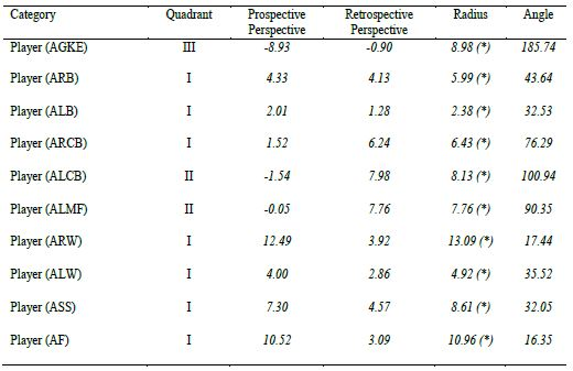 For the focal behaviour of the ARMF player, the players with the most dual interactions (quadrant I) are ALCB, ASS and ALMF. By the length of the radius we can verify the significance of the relationship between the player in question and the ALCB player (both in the retrospective and prospective planes). The ARW, ARCB, AGKE and ALW players appear in quadrant II. No relationship of inhibition is observed. Relationships with the AF and ALB players randomly appear in quadrant IV.