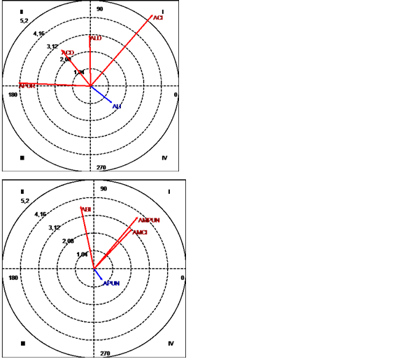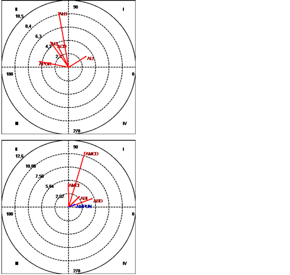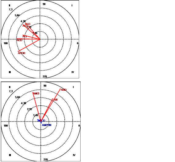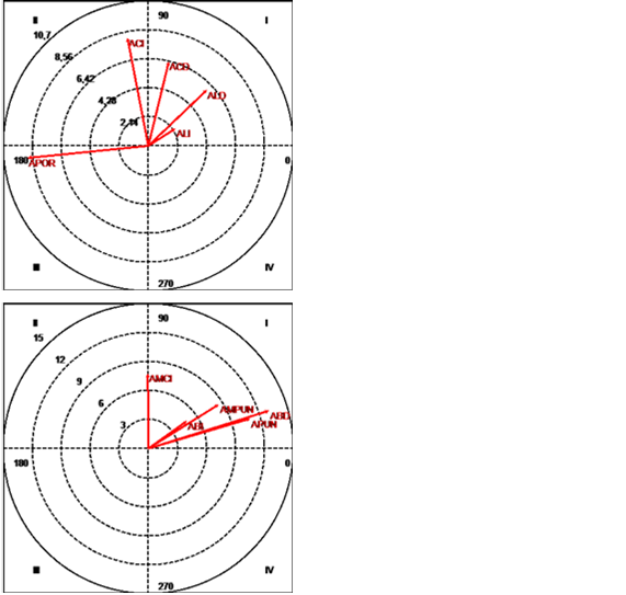 The results of the analysis show the collected vectorial planes represented by the polar coordinate graphs and the tables containing the values that refer to the quadrant, radius and angle of the vector. Vectors that have a greater length than the radius will be considered significant, since this represents a value greater than 1.96 (p<0.05).