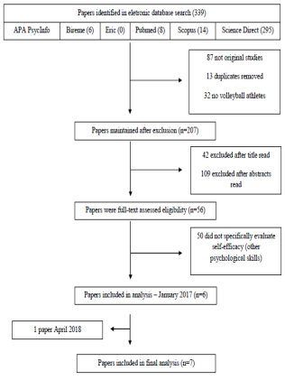 Figure 1 shows the steps followed in the systematic review performed in the present study. In the initial search, a total of 339 articles were found. In this search, the period of publication of these studies was not defined, in order to analyze how this construct has been evaluated over time. After searching in the six databases previously mentioned, and introducing the exclusion criteria, the following articles were removed: non-original articles (87), articles repeated in more than one database (13), articles that did not evaluate athletes from volleyball or included recreational athletes who sporadically played volleyball (32). After this first exclusion phase, other studies were excluded after reading the title (42) and abstract (109). Then, the 56 full-text articles were read, identifying 50 studies that did not specifically evaluate self-efficacy, but rather other psychological skills. The first search was conducted in January 2017, and it was updated in April 2018. In this time interval, only one study met the established criteria, and therefore it was added to the previous 6 articles in this systematic review. Thus, seven studies were maintained for analysis in the present systematic review.