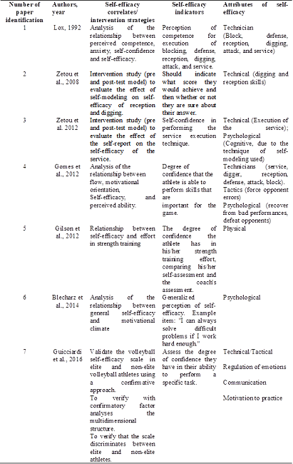 In the reviewed articles, we also tried to identify indicators and attributes contemplated in the instruments used to evaluate self-efficacy in the specific context of volleyball. The first two columns of table 2 include the identification of the paper (identification number of the paper and authors and year of publication), followed by correlates of self-efficacy and intervention strategies, self-efficacy indicators, and attributes of self-efficacy (technical, tactical, physical, and psychological).